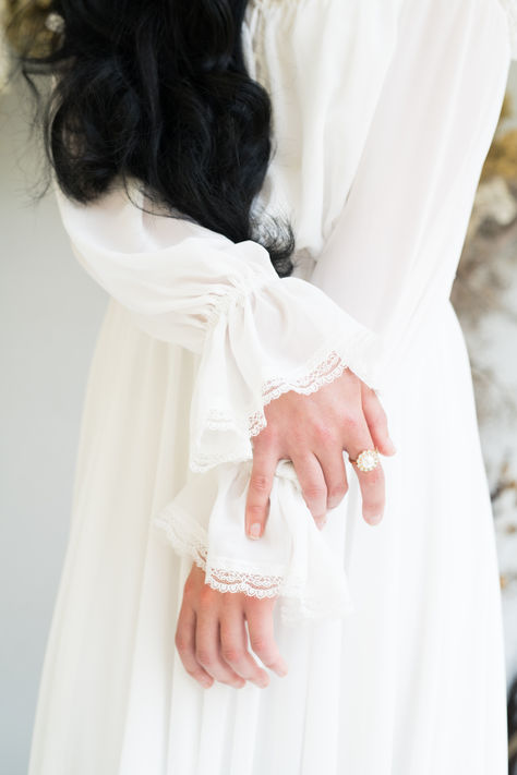The Harmony is a simple wedding dress designed with the minimalist bride in mind. It features long ruffled off the shoulder sleeves, thin straps and an endearing laced trim. A full length A-line skirt made of several layers of soft fabric create this extremely comfortable and simple gown made for the modern woman that loves simplicity.